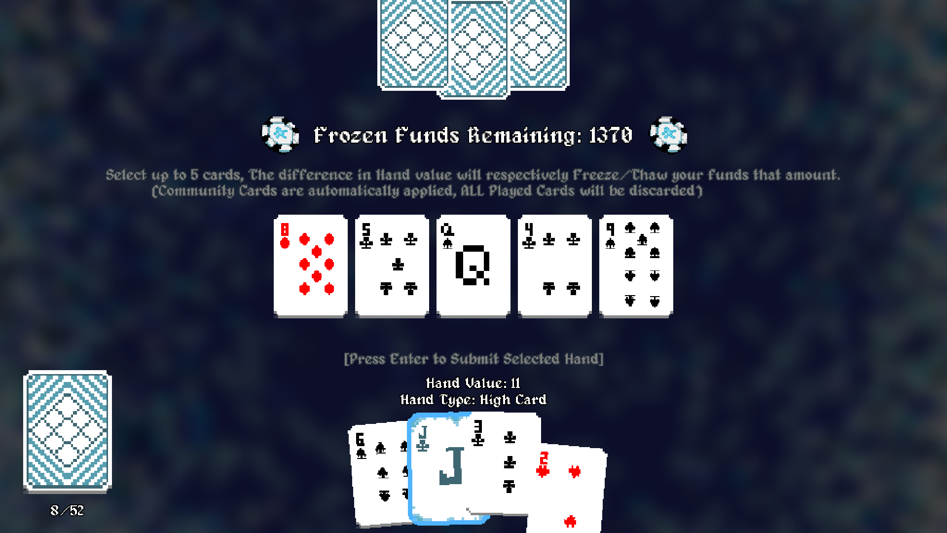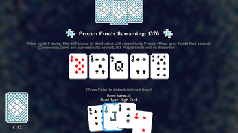 No sprawling lore, no complicated systems. Just you, the cards, and the cold grip on your frozen balance. Win to thaw your funds. Lose, and watch the ice thicken.